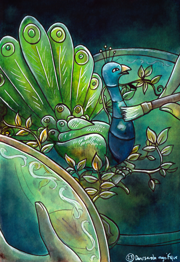 The male teacock's extravagant handles evolved to attract the attention of the drabber-colored teahen. The males with the largest, glossiest, and most brilliantly colored handles will attract a small harem of females. Males compete only by display, and will not engage in actual battle for fear of chipping.The downside to the spectacular display by the males is that lugging around such a weight of crockery makes them more vulnerable to hunters, particularly the aquatic crockpotodile, the teacock's chief predator.
