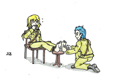 Uncolored: sta.sh/026jb3du645rLeona from King of Fighters in her classic outfit, though her design is based on Senran Kagura's depiction of her. With her nickname, The Silent Soldier, Leona needed to live up to the expectations to that name so she went through some of the most extreme forms of training given to her with new methods of training added every now and then. She finally found a method she has difficulty in during her endurance training. Since she is expected to be tortured if captured, Leona went through various endurance tests (Ex: holding your breath as long as you can, combat training in a snowy environment, etc) and find herself unable to keep silent when she subjected herself to the tickle torture test. Although she can resist giving out information under such torture, being unable to stop herself from laughing is a major concern for her. Despite failing not to laugh, she decides to endure further until time is up as it is still part of her training and will continue to try until she can successfully stop the urge to laugh.