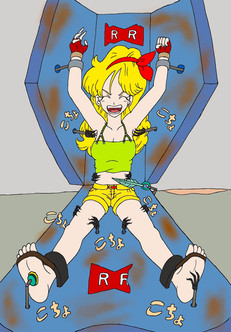 Livie is unable to use her God Arc as her Variant Scythe was dropped and taken away by one of the robot hands. Struggling to escape, she attempts to survey the room she is trapped in while constantly laughing.