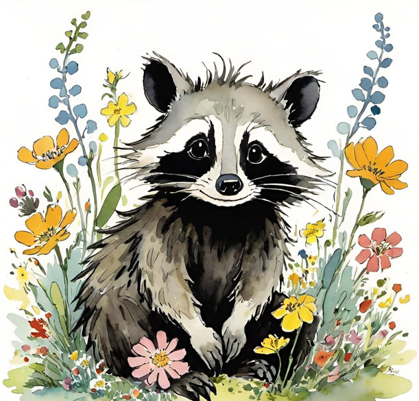 Small illustration of a raccoon meditating on a hillWinsor&Newton watercolors, white gel pen.