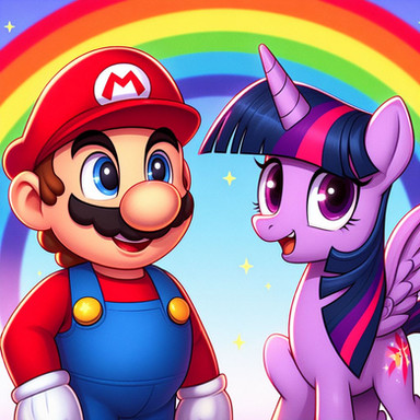 Here's Mario and his pony friend Rarity! This one has Rarity wearing a crown on her head!This picture is made with Bing Image Creator!