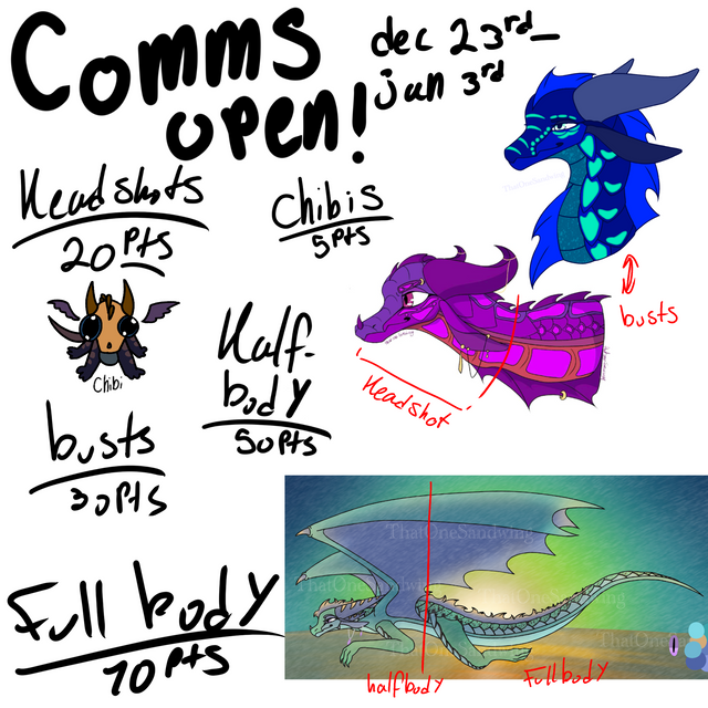 Hey y’all! I’m doing colored-sketch commissions so I can save for some adopts!As it says, headshots are 50pts, busts are 100pts, halfbodies are 200pts, and fullbodies are 300pts.