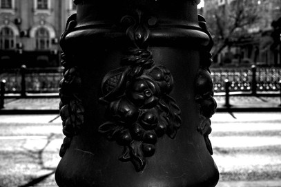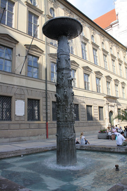 ... Jürgen von Woyski (1929-2000) schuf den markanten Brunnen in der Cottbuser Fußgängerzone (Spremberger Straße) 1977. Verschieden hohe Säulen tragen große Schalen, deren Keramikplatten ornamental mit pflanzlichen und anderen Mustern verziert sind. Auch zwei Friedenstauben (Doves of peace) sind darunter.