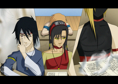 You’ve met the Children of Hidden Leaf [link] , and the Children of the Sand [link] ; now, I’m pleased to present the Uchiha addition to my GeNeratioNs crew, the ‘Children of the Shadow.’Some of you may have noticed that, after my first two “GeNeratioNs” pics, all of the young kunoichi in the Narutoverse seemed to be already taken, and poor Sasuke was left all alone. If you did notice this, you probably assumed that I would a) find a character from the anime, like I did for Kankuro and Gaara, b) create an OC, like I did for Kiba, or c) do something crazy like pair him with Tsunade…but…