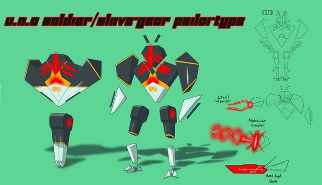 -Ion Blade: Instantly generated on the left forearm from the mecha's own internal power source, the ion blade is a close quarters weapon best suited to assist in grappling situations. Curved and sharp enough to cut at the cellular level, the weapon is highly versatile and can be used for almost every encounter, however, maintaining the blade is an egregious waste of energy and as such it should only be used in moments when it truly counts. Depending on needs, the blade can be weakened or strengthened, and in a pinch can even work as a suitable shield to energy and physical assaults. Famously utilized in the battle against the Syyd in Amsterdam.