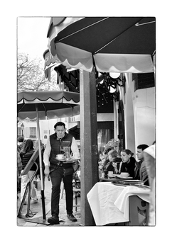 I especially like those checkered diagonals on the stairs (the shadows). They provide a line from the woman to the dog to the folks walking away. Very strong composition (it could still use minor tweaks, but these were probably beyond your control).