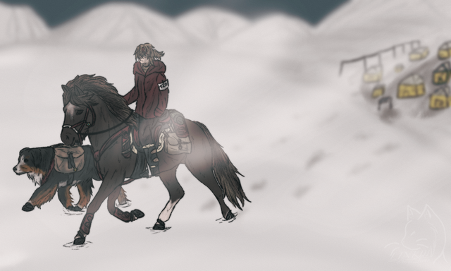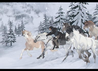 The Obertauer event is soon and the three Obertauer who reside at Arryn Hall still run free and semi wild on one of the biggest inclosures on our ground. So yeah, they need to come back to the stable to prepare for the competition in Tibet. It took the two of them almost half a day to find them strolling around in the hills, and they made sure they wouldn't be captured that easily. While the stallion still belongs to me, the two other depicted on this piece will move into a new home. 'NPA Strawberry Fields Forever', the roan mare is a present for , while the chestnut mare 'New Passage's EuroStar' belongs to now