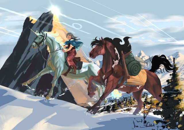 The landscape looks amazing, thoose details! ;^; The poses from each horse is stunning and you can really see that the chestnut mare is FIGHTING to move up that hill and away from them. And the storyline makes it soooo much better. ;;A;;