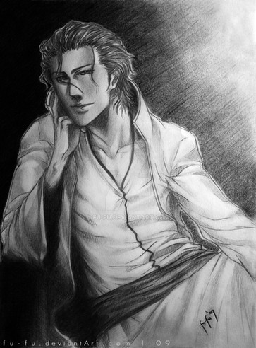 Aizen looks like an anime-esque James Dean in this art! Also worth note, Aizen is a full psychopath (that kind of person who looks amiable and harmless outside, but his heart is cold, unaffective, remorseless, egomaniacal and incapable of true love of human "positive" affections, who sees other people/living beings as no more than pawns for their own narcissistic pleasure and deranged games for personal power)! Watch out for Aizen, evil masked as a kindful man!