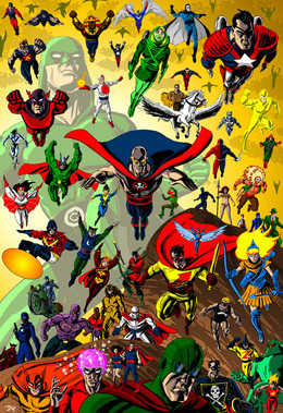 Hmm, let's see if I count everyone right. Samson, Hydroman, Fighting Yank, American Spirit, Mr. Face, Owl, V-Man, 'Devil, Masquerade, Black Terror, Flame, Target and the Targeteers, Scarab, Pyroman, Green Lama, and Arrow.