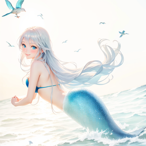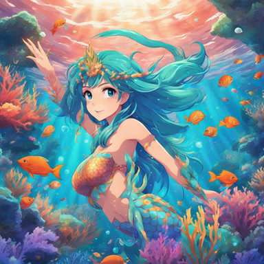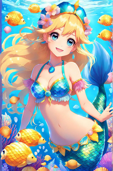 A friendly blonde mermaid waves to you as she swims lazily through a tropical sea.Created with Stable Diffusion using Anything V3, V4.5 and a whole lot of inpainting and fiddling.