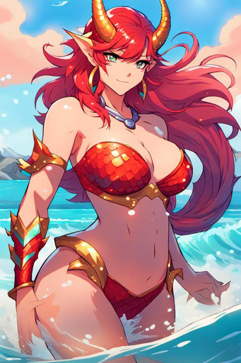 A bold red mermaid, playing in the surf.Created with PAI_Counterfeit on PixAI.