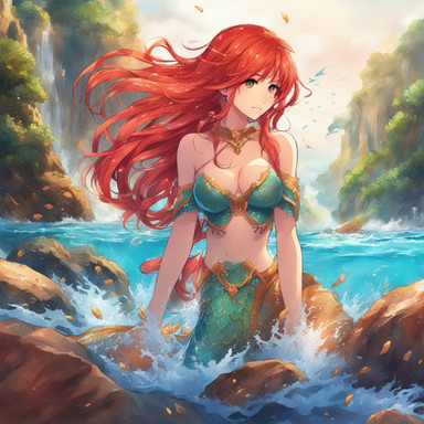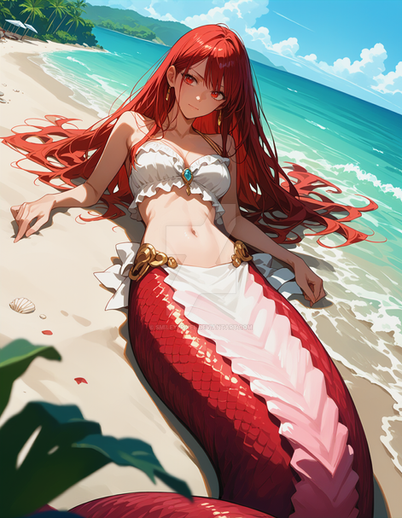 A beautiful redheaded mermaid, enjoying the sun on the shore.Created with PAI-Counterfeit on PixAI.