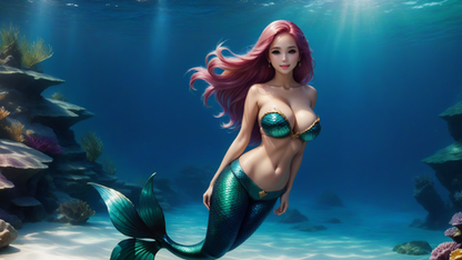 A striking red mermaid takes a break in a hollow of her home reef.Created in Stable Diffusion with the Dreamshaper model.