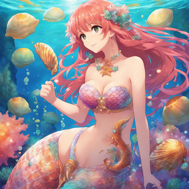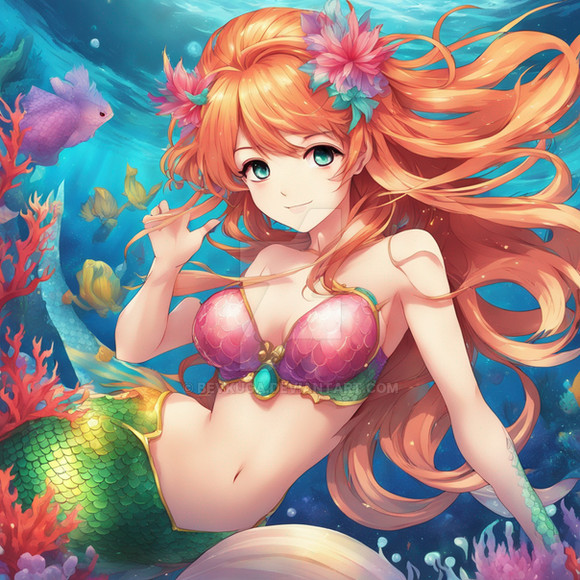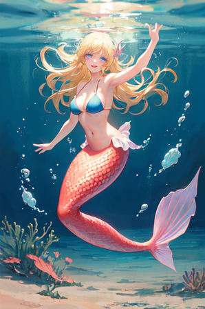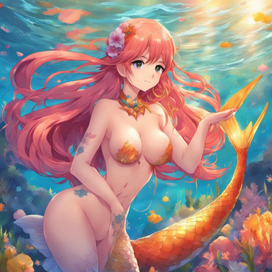 A beautiful red-tailed mermaid seems to tempt you into the depths - or is she just wearing that tail?Created in Abyss-Orange-Mix on PixAI.