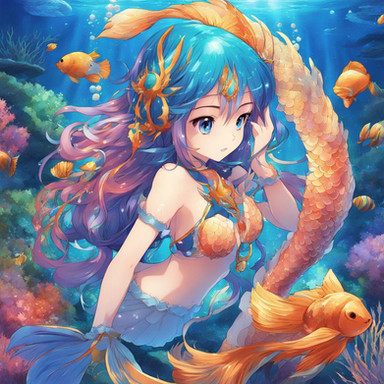 This pretty blonde-haired mermaid seems surprised to meet you as she makes her way around her home reef.Created in Stable Diffusion using the VelaMix model.