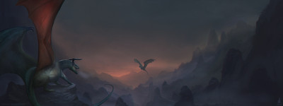 Very nice, I like the dragon's posture. It portrays a sort of tentative eagerness. Your use of lights and darks in a smokey setting was also well done. The light is there, and it does illuminate the scene, but it is greatly overpowered by the shadows cast by the smoke. The curve of the valley and surrounding peaks was a nice touch.