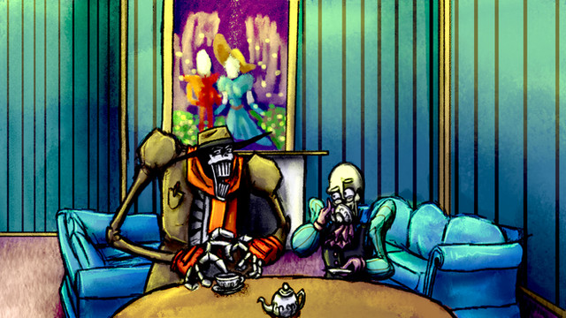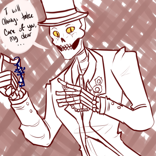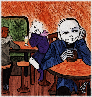 *While the bar is in its buisiest time you see a Papyrus-alike figure in a black trenchcoat with a strange package in their arms. Only a slight blue glim under the blanket tells you that there must be something alive inside.
