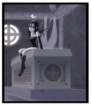 Those eyes... I can't stop looking at those scary eyes and that smile.. Is like she's having a good time, enjoying the viewer reaction on what's she's doing to that bird. The white brighty background helps a lot to focus on the char too. Nic, nice piece.