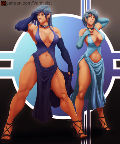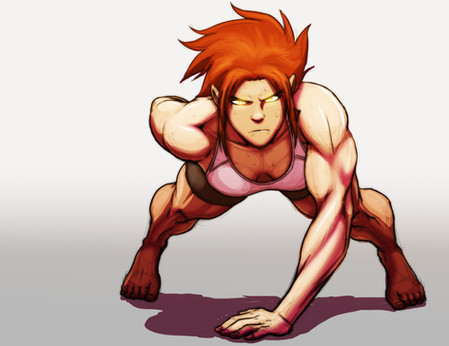 Stomping her way into the roster of huge, beefy women drawn around these here parts is Runo! the OC of the wonderful and a walking, stalking double-threat of both killer physique and extensive hair care. (Seriously, that's gotta take a lot of brushing and conditioner to get a mane like that to shimmer and shine)Thanks, Uju, and enjoy!