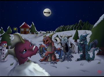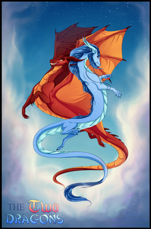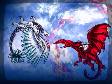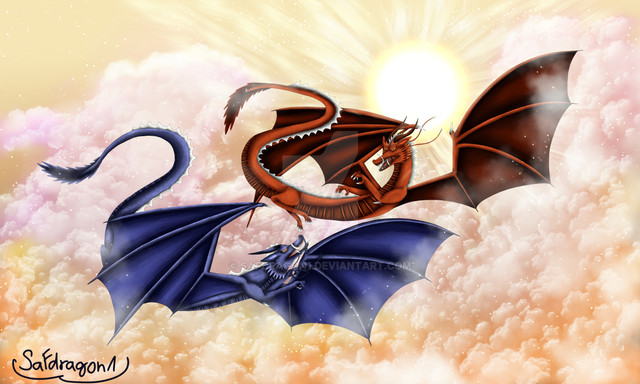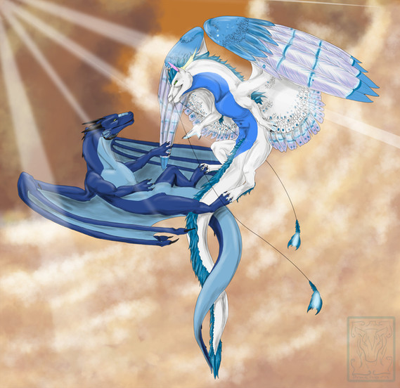 This is really nice to look at and I like this kind of drawings that portrait contrasts like this one. It looks quite spectacular, specialy the work that you did with these two dragons, they have fantastic designs I love the feathers, they must have been challenging to draw, but seriously, they're gorgeous. This perspective and the flying poses are great, they give the drawing a cool sensation of action. I like how happy they look. ^^ The light effect of that ball of energy is very well drawn.