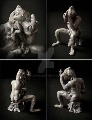 Is this supposed to be SmeagolGolum from LOTR? The ears and feet make me think of him. Either way, its really well done. its not so obvious that it's him so there's that mystery still left to the piece. Then all that aside, it is very thought provoking. Really makes me think about that character, and the concept itself. Your DailyDeviation is very much deserved!