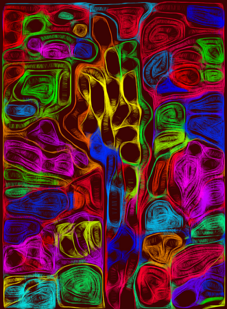 One thing about abstract art that I have noticed over the years, Ann, is that the palette of colours used has a tremendous influence on the visual effect and mood. The underlying reason is that in our daily lives we are used to a "normal" palette of greens, browns, greys, ochres, enlivened by prominent colours such as reds and blues. These all occur with a sort of "normal" frequency and we spot something unusual because the colours are outwith that normal expectation - adverts are a good example. With abstract art, there is no reason at all to stick with any normal palette or any normal frequency of colour usage. So, developing your own palettes that are meaningful and coherent (even if totally random) is a key feature of successful abstract work. Although applied to fractals with high structure, Coco's (kayandjay100 ) palettes are very good examples of coherent colour schemes. I recall UF and Apophysis have very good palette editors such that you can build and store your own schemes. So, with this image a more subtle palette might bring out the contrasts in line and shape more effectively. Palettes are a huge business!