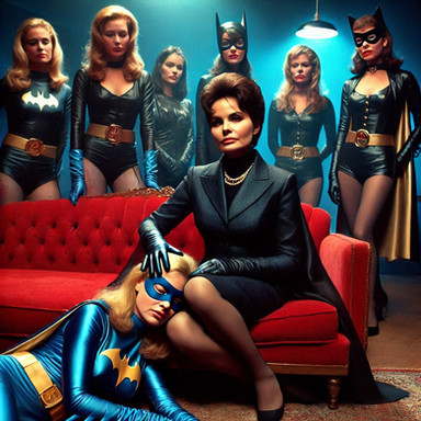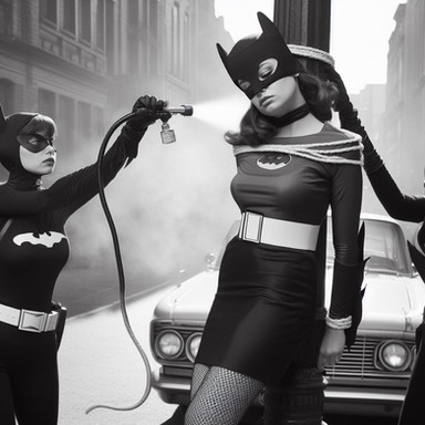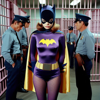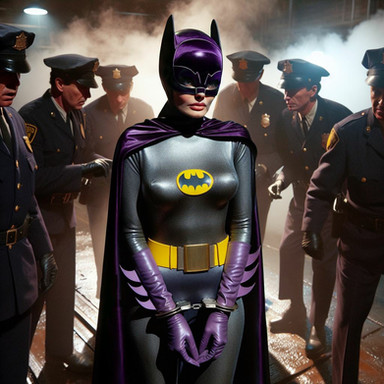#1966 #batwoman #briefs #cape #cowl #heroine #utilitybelt #garterbelt #garters #goodgirlart #maskedwoman #handcuffedwoman #arrestedwoman #briefsgirl #capedheroine