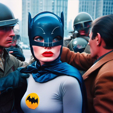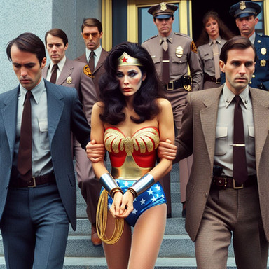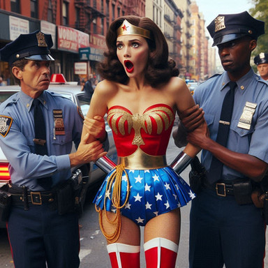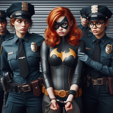 Caped Cutie Collared !Batwoman is being arrested for violating the new superheroine dress code regulations. These puritanical dictates have affected other heroines as well, including RopemasterSecretspy witnessing Wonder Woman's apprehension.