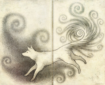 After finishing more serious work, I like to wind down wind down and play with media. I free handed the inks of this kitsune critter with a brush and ink, used white paint and colored pencil to ad some form and went goofy with gold ink and leafing pen. I also put a real stone in the forehead, so this piece is pretty shiny in person.All in all, it was relaxing. Anatomy errors abound, I tell people all the time I suck at drawing. No one ever listens.