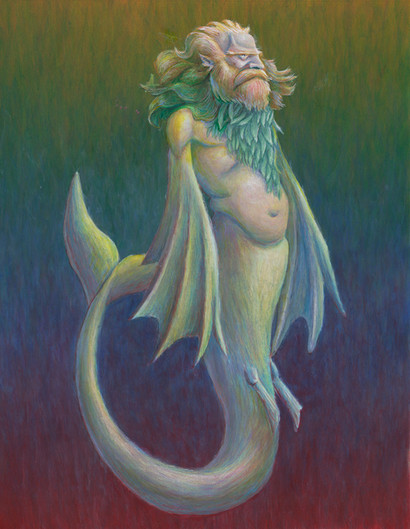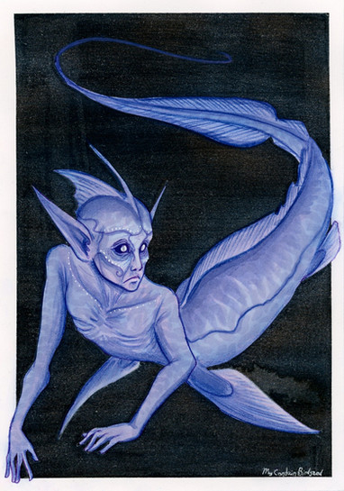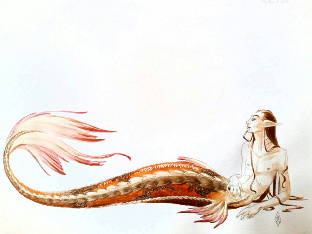 So there was this challenge over on tumblr to do an unconventional merfolk design! I dunno how unconventional this is (somewhat eel-ish?), but I had fun sketching it at work between renders and other stuff.Used the coloured pencils at my desk; a ludicrously small selection of colours XD;;; the background is grey markers and white coloured pencil/white gel pen for the highlights.