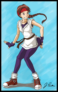 I say "challenge", but it really wasn't, when you check the references. Mai may have her iconic kunoichi outfit, but she DID have a more conservative outfit in her appearance in Fatal Fury 3 and Real Bout games, so I took that, and adapted it with my own touches for a slightly more updated take.