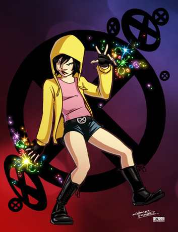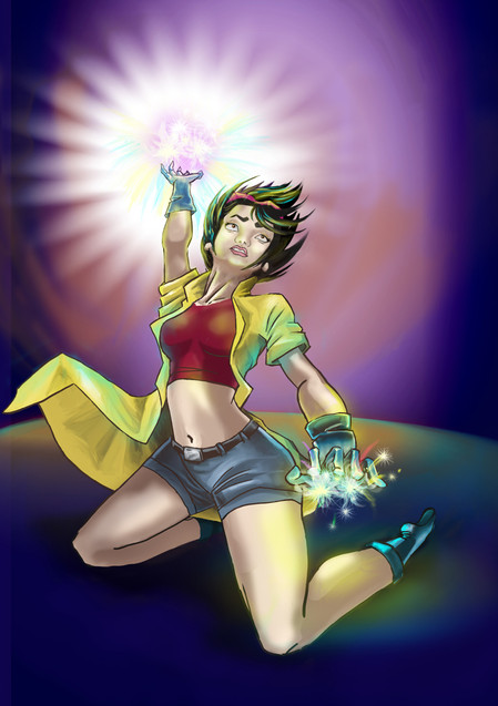 This is actually a painting of a friend dressed up as Jubilee of the X-Men (is she still part of the team, even in a reserve capacity? I've lost touch...).Originally a black and white line piece, I added this special colored version. Special in the sense that I did my best to make the colors stand on their own without the actual line art.