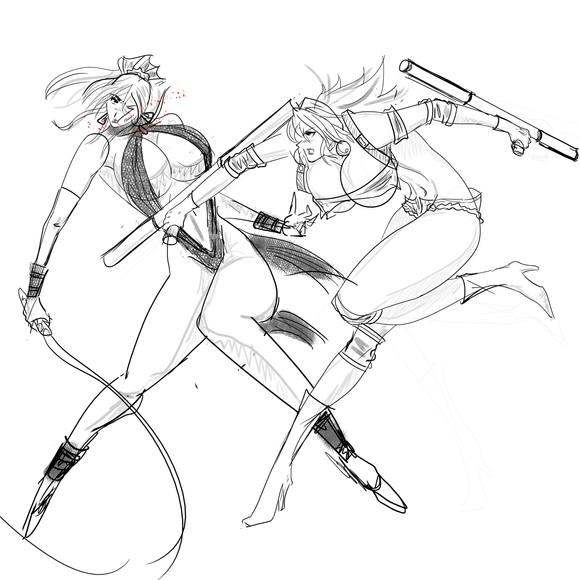 Kitana vs Katarina! This Holiday Commission is unique. The girls in this case come from my other fighter project, and on top of first two similarities noted above, I inadvertently posed both characters in a similar manner. So this VS pairing almost made itself. The pillow sword and fan hint what could have been an epic pillow fight.