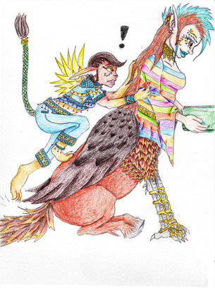It was then she noticed her feet. Were they her feet? Her toes were long, and she only had three of them on each foot, each ending in a sharp claw. She shifted her weight, realizing that her legs had changed as well. Her arms were still changing, and she watched in strange, detached horror as her fingers elongated and her arms turned into a pair of feathered wings, the same color as her hair. Her own hair was actually falling off her head, being replaced by a coat of feathers, as were parts of her back and shoulders where her skin tingled the most. As her body twisted and reshaped itself, she found herself not so much scared, but almost entranced by the transformation. Her fear had turned into a kind of euphoria that she found hard to explain, and she was almost lost in it until she heard that voice.