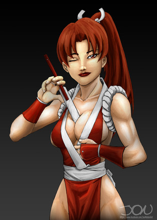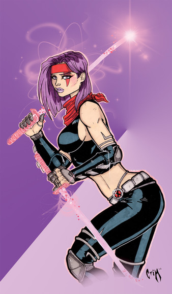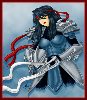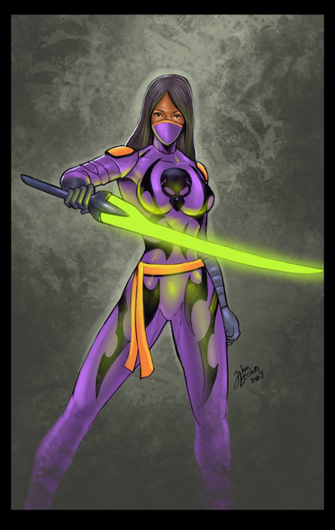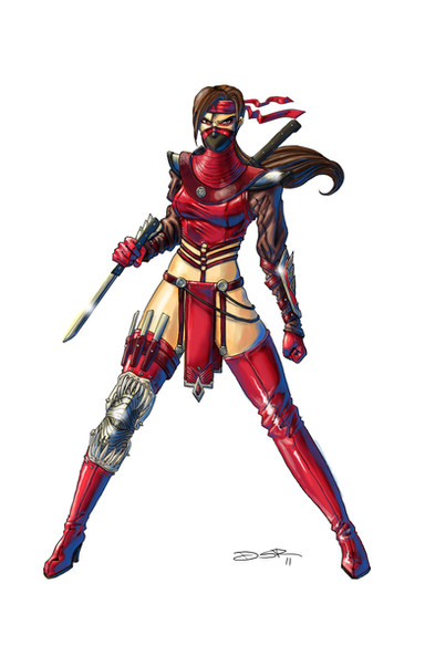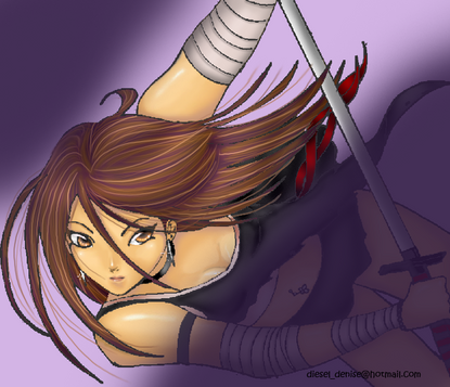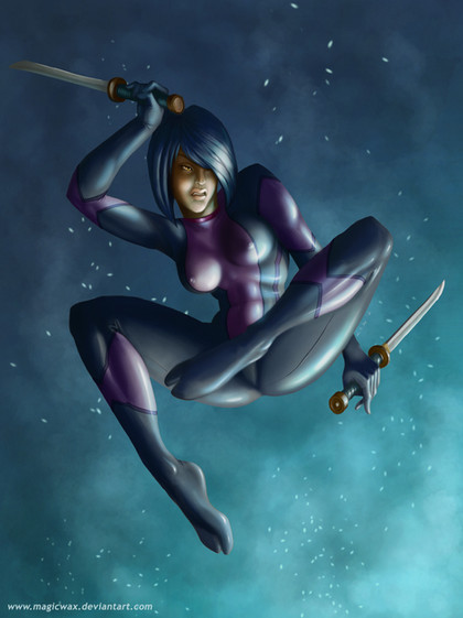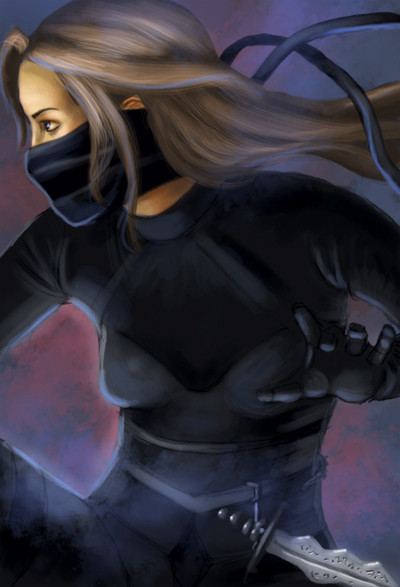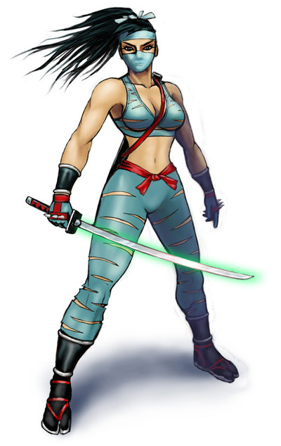 Here's a collaboration with of 's Ninja Girl character. His original lines can be found here: [link]I made some adjustments, mainly tweaking the anatomy and sword. The hair was done with a custom brush, but everything else was done with standard CS3 brushes. The sword was rendered using the pen tool, in order to get the curve just right. I know the actual ninja's sword was a straight edge, and this might be closer to a samurai's wakizashi, but the curved blade felt more dynamic.