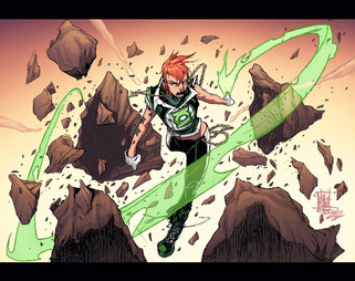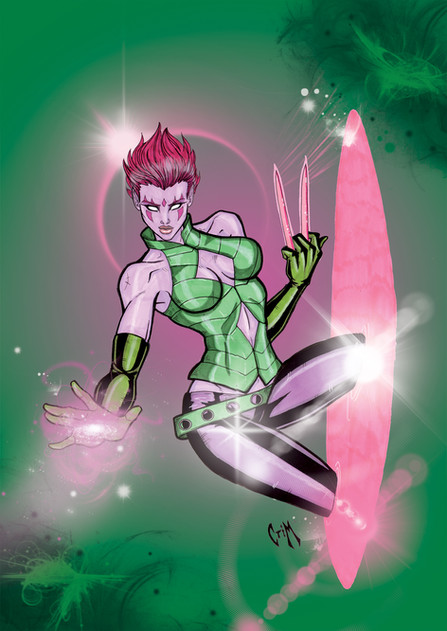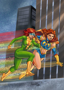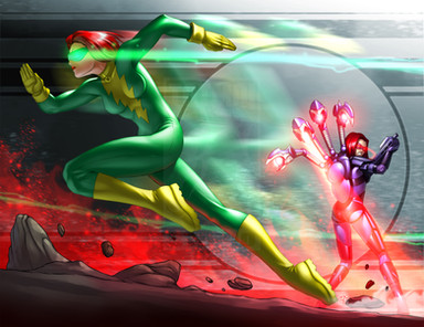 Ok, fan-mode off! This was colored by first creating a grayscale rendering of the entire piece, then applying colors over that. After the basic colors were placed, I did some additional rendering in color on the "main" Velocity to fix her up a bit more. I also did some editing on her face, since it was looking a little too wide, proportionally. Once I was satisfied with the colors, I went on to add glowing blur effects to the characters, as well as the foreground and background.