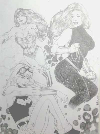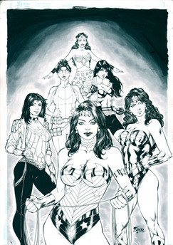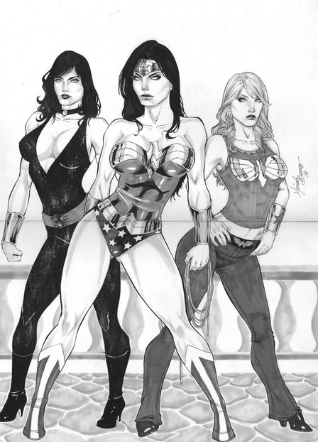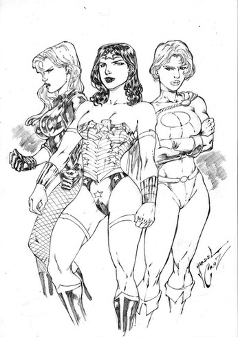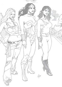 This was one of a pair of commissions that I did involving Wonder Woman, which came about after I originally posted Supergirl on the Adam Hughes Yahoo Group. These were the very first commissions I ever had, and I thouroughly enjoyed working on each of them.Due to the scan itself being in black and white, one of the more interesting points in the pieces did not carry over to this image. Wonder Woman's lasso was actually inked with a gold metallic ink pen, and both were signed by me using a special chop that and I bought during a trip to China.