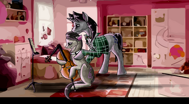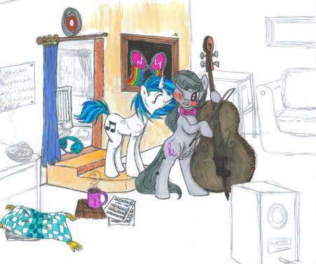 Their shared appartement is in Manehattan, where the sun is going up. Octavia starts practicing on her Cello, and Scratch, who is well rested for once, greets her with a little kiss on the cheek.
