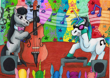 Very cute! I love the posters, especially the Vinyl's shades one. Crying rainbows-that's a new one! The only thing is, I think there is a bit too much wrinkles-around Vinyl's mouth, on Octavia's belly, etc. I think simpler is better in this case, since there's already so much going on in the scene. I love this!