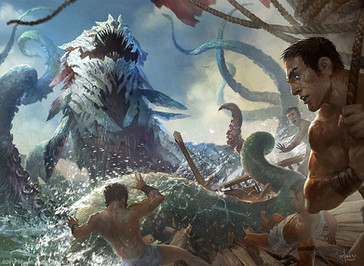 one look at this and it brings you into the fantastical world that only exists in imagination - i love how the red and blue bring out the details of the sea monster and the water!! ahhh! so nice ><