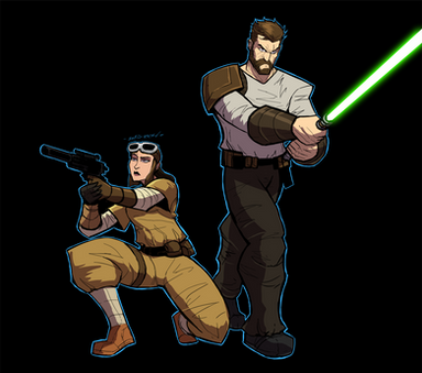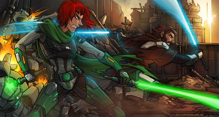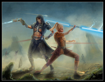Wow! This is a badass, awesome work of Satine and Obi-Wan. Really, really like the dynamis and atmosphere here. Also, awesome work on the perspective and textures. Love how pulled off those red fire-reflections on Satine's blue outfit.