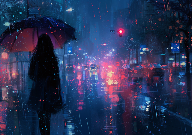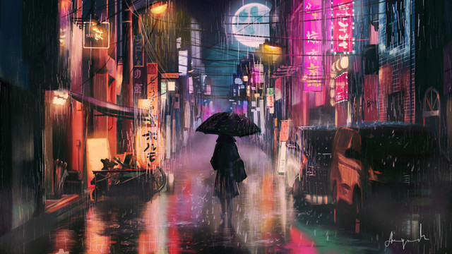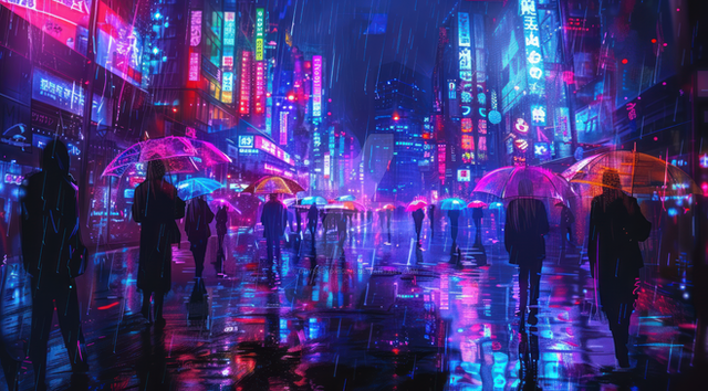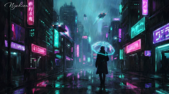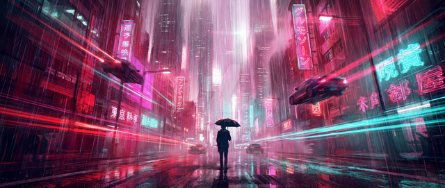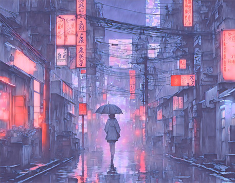 #atmospheric #bladerunner #conceptart #cyberpunk #digitalpainting #fuchsia #neon #nightcity #noir #rain #scifi #streetphotography #tokyo #umbrella #generativeart #aiart #synthwave #vaporwave