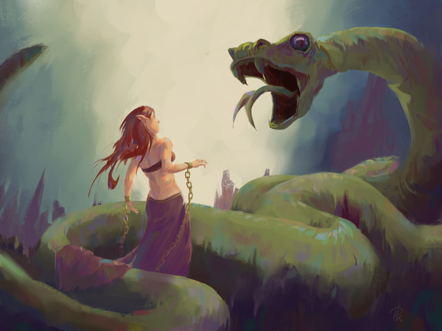 . Интересно, что дизайн его морды, а точнее наличие "украшения" на лбу, перекликается с украшением на голове девушки. Создаётся впечатление, что она - некая ритуальная жертва, а дракон живёт в заброшенной части города, жители которого "откупаются" таким образом от зверя, которого не в состоянии победить, либо он является священным животным для них. И дракон большую часть времени спит, зарастая мхом. Дракон, кстати, выглядит довольно медлительным, он мощный, но громоздкий и тяжелый, разленившийся за столько лет. Перейдём к девушке. Лицо, работа с украшениями и деталями нравится больше всего. Как я уже говорила, украшения у тебя славные. Блеск, детали, текстура металла, всегда очень здорово и вкусно