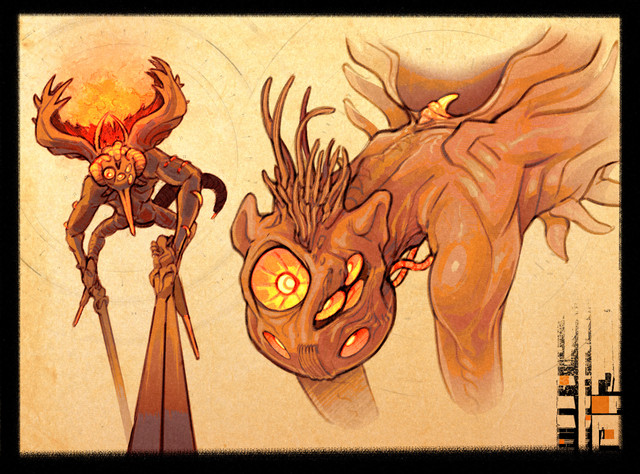 Классное психоделическое существо. Мне нравится, особенно оранжевые вставки и части тела, идущие от ног к телу. Хорошо перебивают вертикали ног.