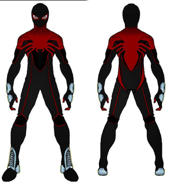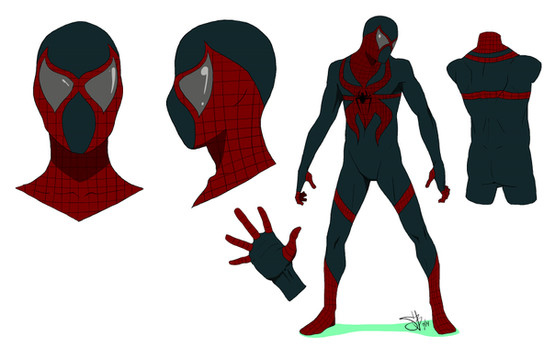 I made the suit look more armor like, padding. Most his enemies are bigger and stronger, so one would need a suit like that in my opinion, Right? I also wanted to keep the spider insignia on his chest, but I incorporated the spider legs into the rest of the costume, breaking it up. I used black instead of red because it would be more stealth like, instead of blue and red. I added a honeycomb texture in place of the webbing pattern just for esthetic reasons. I also added a zipper seam on the costume because I imagine with all the superhero costume it would be a pain to have to hop in and out of a unitard. Plus what if you had to pee?