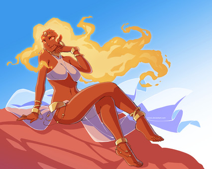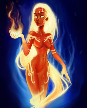 It's exactly how I'd picture a female elemental, with the ruby colored skin and the hair~