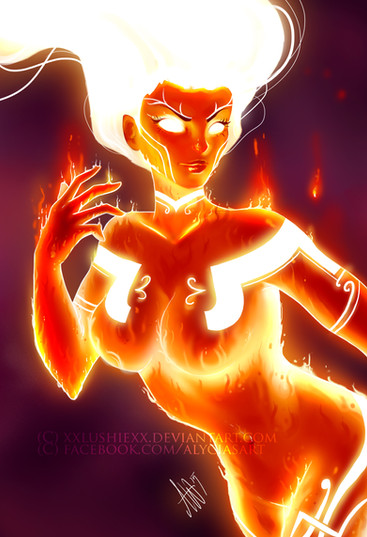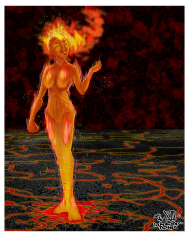 3 months and a half after the air one, fire! Of course it had to be a curvy, half-naked lady, because that's hot : D *shot*Let's all love how her hair is much freakier than that tiny fireball-thing she's holding, lol. *needed a lame excuse to draw that hand position*