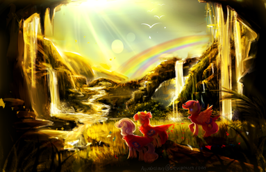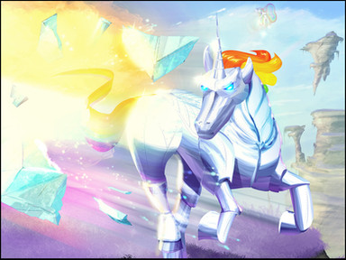 I liked them all, especially your Fluttershy and Applejack versions, but this......this is just.....too beautiful for words. Phenomenal. This little series of artwork is so inspiring and beautiful..... The sunset and that glistening water really is the icing on the cake, except this cake's icing is made of pure gold. I could look at these for hours at a time, just taking in the beauty of all the fine detail and the creativity of the idea.