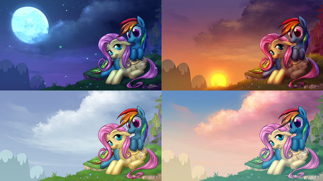 This one is also a heck of a lot brighter and has a more cartoony color palette than my usual stuff. With this one, I just wanted to have the base colors show through, and not be changed much by the highlights or the shadows. The shadows are also extremely light on this, as I wanted the environment to be very soft and kinda hazy like they were high up in the air, close to the clouds.